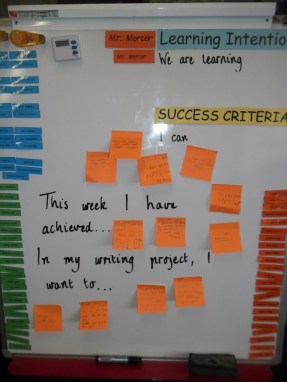 Once they have finished their reflection and goal setting (and received instant feedback via a quick conference) they take a post-it note and write a 'wish' for the following week – this might include an area that they wish to learn more about, an iPad app they would like to use or a Writer's Workshop they think would benefit their project.